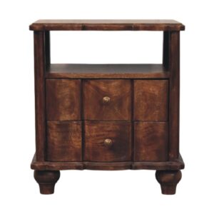 Handcrafted from 100% solid mango wood, this elegant bedside showcases a soft, curved silhouette and classic ball feet. Finished in a warm Roasted Almond tone, it features two compact drawers with antique-style knobs and an open shelf for added practicality. A refined and functional piece that brings quiet sophistication to any bedroom setting.