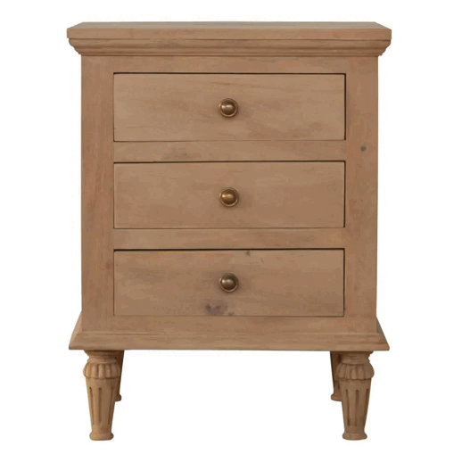 Standing by your bedside taking care of those things you need close by at bedtime: book, glass of water, phone; this three drawer bedside will add warmth and character to your space. Beautifully made from 100% solid mango wood with a smooth sun bleach finish, its clean, elegant lines give it a timeless appearance. Other features include 3 drawers, hand turnedfeet and ring pull handles made of brass.