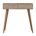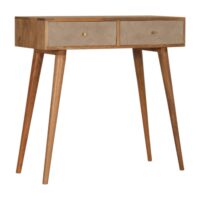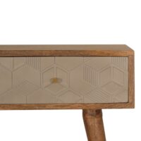 This stunning piece has been constructed from 100% solid mango wood and features Nordic style legs. It provides useful storage with the space of 2 drawers finished with shiny knobs. The champagne hand carved cube design is partnered nicely with the finish of the wood giving an overall modern and chic look.