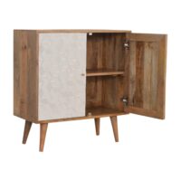 This stunning piece has been constructed from 100% solid mango wood in an oak-ish finish and features nordic style legs. It provides useful storage space and is finished with shiny knobs. The teal and white hand-carved cube design is partnered nicely with the finish of the wood giving an overall modern and chic look.