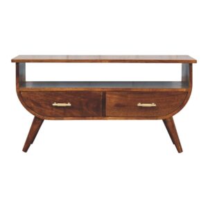Introducing our eye-catching media unit, crafted from 100% solid mango wood with a chestnut finish. Its features include Nordic-style legs, shiny gold t-bar handles, and a generously sized open shelf, it’s the ultimate blend of style and functionality. Elevate your living room with this essential and elegant piece.