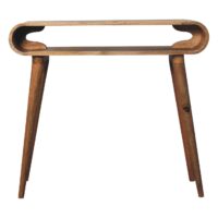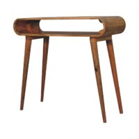 Explore our Amaya range featuring this simple open console table which is constructed from 100% solid mango wood in a chestnut finish and features nordic style legs and smooth round edges, which will give a modern feel to the home as well as be safe around small children and animals. Display this piece beautifully in your home and allow the natural grain pattern to really shine.