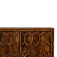 Transform your living room into an art deco haven with our Amouri cabinet. It has been constructed from 100% solid mango wood in a chestnut finish and features intricate carved detailing on the door fronts and shiny brass knobs, as well as nordic style legs. This piece is bound to make a chic addition to your room.