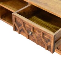 Transform your living room into an art deco haven with our Amouri media unit. It has been constructed from 100% solid mango wood in a chestnut finish and features intricate carved detailing on the drawer fronts and shiny brass knobs, as well as nordic style legs. This piece is bound to make a chic addition to your room.