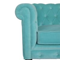 This beautiful 2 Seater Chesterfield Sofa has been upholstered in a luxurious smooth aqua cotton velvet. It features 4 turned feet constructed from 100% solid mango wood in a walnut finish. This sofa is detailed with deep button tufts, piping and sheltering arms. This is a statement piece which can be added as a pop of colour and be suited to different home settings.
