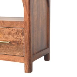 Bring form and function together with the Arc-Line Media Console, handcrafted from 100% solid mango wood in a rich Roasted Almond finish. Designed with a smooth arch silhouette and clean lines, this console offers a spacious open shelf for media devices and two deep drawers with sleek brass-finish handles for concealed storage. Its refined aesthetic adds architectural character to your living room while keeping everyday clutter neatly out of sight.