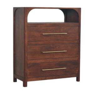 Graceful and grounded, this 3 Drawer Chest is handcrafted from 100% solid mango wood and finished in a deep Winewood Oak tone that highlights the swirling natural grain. The gently arched open shelf softens its bold, linear silhouette, creating a stylish space for display or easy access. Below, three generously sized drawers offer practical storage, accentuated by sleek brass-toned handles that lend a contemporary touch. A perfect blend of form and function, this piece is designed to elevate bedrooms, hallways, or studies with understated sophistication.