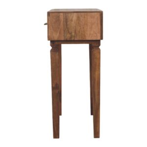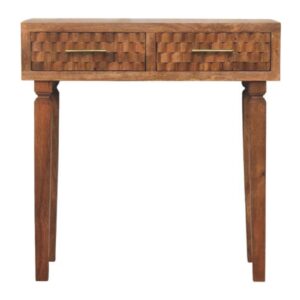 Add a touch of refined texture and warmth with the Arno Console Table in Golden Teak. Expertly handcrafted from 100% solid mango wood, this elegant piece features intricately carved drawer fronts that celebrate artisanal detail. The natural golden tones highlight the wood’s grain, while slender legs and brass-finished handles complete the look with understated grace. Whether placed in an entryway, hallway, or behind a sofa, this table brings timeless character and practical charm to any setting.