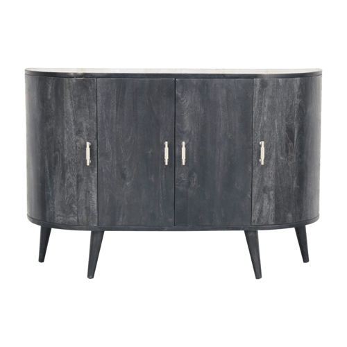Introducing our eye-catching cabinet, crafted from 100% solid mango wood with an ash-black finish. Its features include Nordic-style legs, shiny gold t-bar handles, and generous space inside with 3 shelves leading to 6 slots, it’s the ultimate blend of style and functionality. Elevate your living room with this essential and elegant piece.