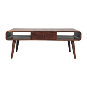 A seamless fusion of mid-century charm and modern practicality, this coffee table is handcrafted from 100% Solid Mango Wood in a rich chestnut finish. Its sleek, curved design features two drawers on both sides, offering ample storage for keeping your space organized, while the open compartments provide easy access to everyday essentials. Resting on elegantly tapered Nordic-style legs, this piece exudes timeless sophistication and durability. Perfect as a stylish centerpiece, it brings warmth, functionality, and artisanal craftsmanship to any living space.