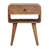 With its mid-century modern charm and timeless craftsmanship, this bedside table is handcrafted from 100% Solid Mango Wood in a warm Oak-ish finish. Designed with a smooth, curved silhouette, it features a single drawer adorned with an elegant brass knob for a refined touch, along with an open shelf for easy access to books or essentials. The sleek, tapered legs add a touch of Scandinavian elegance, making it a stylish yet functional addition to any bedroom or living space. Sustainable, durable, and versatile, this handmade piece brings effortless sophistication to your home