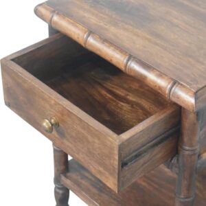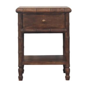 Inspired by tropical elegance, the Bamboo Carved Bedside Table brings refined charm to your nighttime sanctuary. Handcrafted from 100% solid mango wood in a rich roasted almond finish, this piece features delicately sculpted bamboo-style legs and edges. A single drawer with an antique brass knob offers discreet storage, while the open shelf below is perfect for books or décor. Compact yet stylish, it’s the perfect companion for your bed or reading nook.