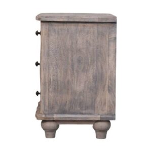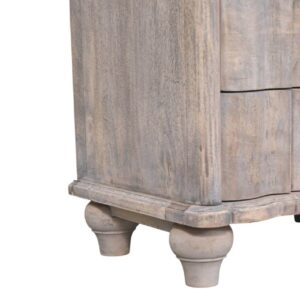 Embrace timeless elegance with the Beaumont Curved Nightstand, handcrafted from 100% solid mango wood and finished in a soft Acid Wash tone. The gracefully contoured front, fluted side panels, and gently scalloped base exude vintage charm, while the turned legs and antique brass knobs add a refined touch. With three compact drawers, it offers practical storage without compromising on style—perfect for classic, French country, or shabby chic interiors.
