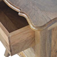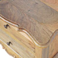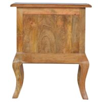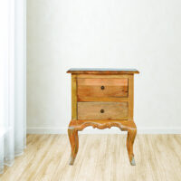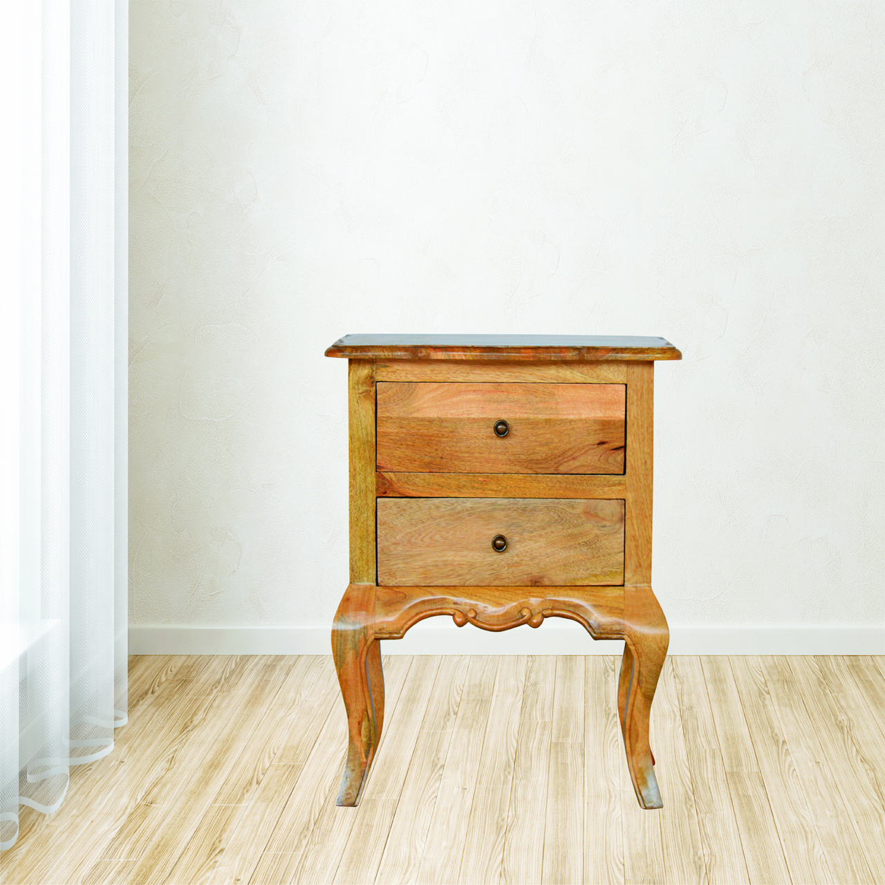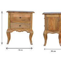 This bedside has been constructed from 100% solid mango wood in an oak-ish finish with 2 shiny knobs and is an elegant addition to any bedroom. It features 2 drawers for storage space and an ample surface area for all your decorative furnishings. Delicate hand carved designs feature scrolls and scallops that flow beautifully with the subtle curves of the chest and cabriolet style legs. Every piece of furniture is individually handcrafted and includes swing care tickets explaining the cautions and aftercare instructions.