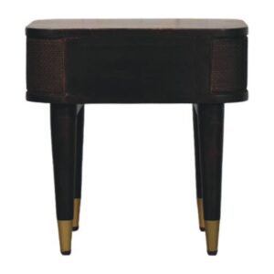 Elevate your bedroom with the Belmont Bedside, finished in a rich Velvet Mocha tone. Crafted from 100% solid mango wood, this piece features handwoven rattan panels on either side of the central drawer, elegantly offset by brushed brass hardware and matching brass-capped legs. A refined blend of texture, craftsmanship, and utility—perfect for modern interiors with a timeless soul.