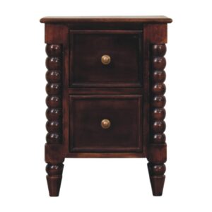 Elevate your bedroom with the rich elegance of the Bexley Spindle Bedside. Handcrafted from 100% solid mango wood in a luxurious Winewood Oak finish, this piece features two deep drawers with brass knobs and beautifully turned spindle legs that add a timeless charm. Perfect for storing evening essentials while making a bold style statement, this bedside table blends classic design with enduring craftsmanship.