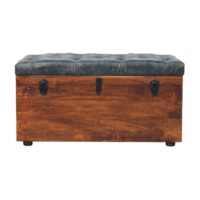 Combining rustic charm with practical functionality, this storage trunk is handcrafted from 100% Solid Mango Wood in a warm California Walnut finish. The hand-tufted design on the plush seat, upholstered in Buffalo hide leather, adds a classic touch of sophistication and comfort. Featuring sturdy metal latches and ample storage space, it keeps your belongings organized and out of sight while enhancing your decor. Perfect for entryways, living rooms, or bedrooms, this versatile piece brings timeless style and sustainable craftsmanship to your home. Its natural wood grain, durable construction, and elegant detailing make it a unique and lasting addition to any space.