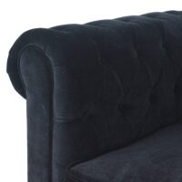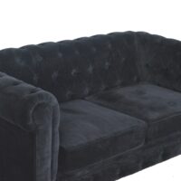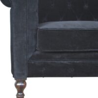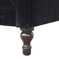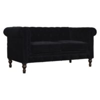 This beautiful 2 Seater Chesterfield Sofa has been upholstered in luxurious black cotton velvet and features 4 turned feet constructed from 100% solid mango wood in a walnut finish. This sofa is detailed with deep button tufts, piping, and sheltering arms. This is a statement piece for the home which can be added as a pop of colour to any room in the home or can be suited well with many different styles and colours of interiors being modern or classic.