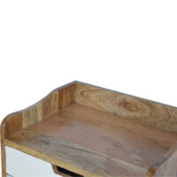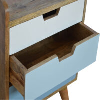 This bedside table is the perfect stand for any bits and pieces you wish to keep nearby before bedtime. It features ample space for a lamp, photo frame or any ornaments. It has been constructed from 100% solid mango wood with a fine oak-ish finish body and 3 blue, gradient, hand painted cut-out drawers. Some other product characteristics are 4 Nordic style legs with cut out slots for easy access to and from the drawers. A lovely pop of colour and addition to the home.