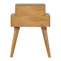 This bedside table is the perfect stand for any bits and pieces you wish to keep nearby before bedtime. It features ample space for a lamp, photo frame or any ornaments. It has been constructed from 100% solid mango wood with a fine oak-ish finish body and 2 different sized, blush pink and white hand painted cut-out drawers . Some other product characteristics are 4 Nordic style legs with cut out slots for easy access to and from the drawers. A lovely pop of colour and addition to the home.