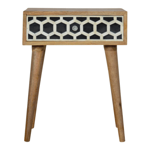This versatile bedside table will prove handy all over your home. It has been constructed from 100% solid mango wood and has a fine oak-ish finish. It has 1 bone inlay drawer which features a glass knob and 4 Scandinavian styled legs. The bone inlay is sourced responsibly from deceased animals such as camels, goats and buffaloes.
