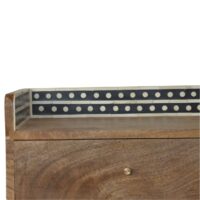 This solid wood bedside has been constructed from 100% solid mango wood in an oak-ish finish, this piece features a charming bone inlay gallery back design that complements the grain and finish of the wood, it has cylindrical knobs for the drawers and stands on 4 Nordic style legs. The ideal piece bedroom. The bone inlay is sourced responsibly from deceased animals such as camels, goats, and buffaloes.