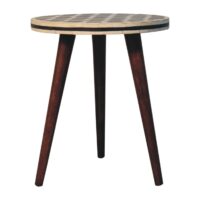 This little tripod stool is a sturdy yet light enough piece to move around easily. It has a nice smooth honey caramel finish constructed from 100% solid mango wood with a beautiful bone inlay top. Out of abundance of precaution, we wouldn’t recommend using the stool as a sitting space. The bone inlay is sourced responsibly from deceased animals such as camels, goats and buffaloes.