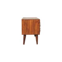 Introducing the “Botanic Flora” Media Unit is a blend of style and functionality. Crafted from 100% Melia wood in a chestnut finish, it features two open shelves for media devices and two doors with floral carvings for discreet storage. Supported by sleek Nordic-style legs, it brings natural charm to your entertainment space. Enjoy the perfect harmony of simplicity and elegance with this exquisite media unit.