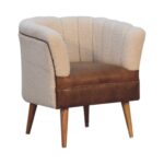 Derived from the French word for ‘curled’ or ‘ringed’ yarn or fabric. This handwoven upholstered armchair is made of 100% cotton and natural yarn, combining a buffalo hide leather seat and noridc style legs constructed from 100% solid mango wood in a oak-ish finish, for added contrast.