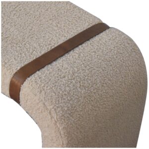 Derived from the French word for ‘curled’ or ‘ringed’ yarn or fabric. This handwoven upholstered furniture piece is made of 100% cotton and natural yarn. This bench showcases a contemporary curved design with a plush, cushioned top for comfortable seating. It features a distinctive belted strap design on both sides, making it an elegant addition to any hallway, reception area, or living room.