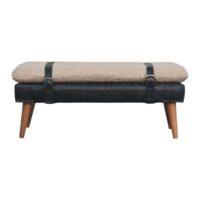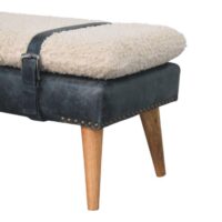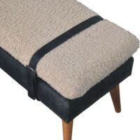 The Boucle x Black Leather Bench showcases a harmonious blend of texture and elegance. Upholstered in 100% cotton boucle fabric and accented with genuine Buffalo hide leather, this piece exudes sophistication and warmth. The belted strap design adds a touch of character, while the nordic solid wood legs, finished in a classic oak-ish tone, provide durability and support. Perfect for entryways, bedrooms, or living spaces, it combines timeless craftsmanship with modern aesthetics to elevate your home décor.