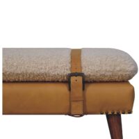 Derived from the French word for ‘curled’ or ‘ringed’ yarn or fabric. This handwoven upholstered furniture piece is made of 100% cotton and natural yarn, combining buffalo hide leather to create a beautiful fusion of colours and materials. It has a belted strap design and also features solid wood legs which have an oak-ish finish providing strength and durability.