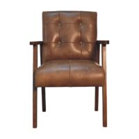 This contemporary armchair is certain to add a sophisticated look & lavish living room or dining room experience. Made from quality buffalo hide leather it is upholstered in a rich olive green colour with a plump seat, and a deep button back cushion. The legs and arms are constructed from 100% solid mango wood in a walnut finish. We hope you love it as much as we do.