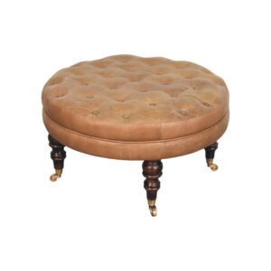 Bringing a touch of heritage charm to your home, this round ottoman is upholstered in 100% Buffalo hide leather with a luxurious hand-tufted design. The deep button detailing adds timeless elegance, while the handcrafted turned legs made from 100% Solid Mango Wood in rich walnut finish enhance its classic appeal. Fitted with brass castor wheels, it offers effortless mobility, making it a versatile addition to living rooms, bedrooms, or entryways. Whether used as a footrest, accent piece, or extra seating, this ottoman combines sophisticated craftsmanship with practical functionality for a refined and inviting space.