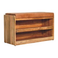 Experience the epitome of space-saving functionality with our solid mango wood shoe storage cabinet. With a luxurious buffalo tan leather top, this exquisite cabinet boasts two drawers, accommodating 6-8 pairs of shoes or boots. Elevate your hallway’s allure while keeping footwear organized and easily accessible.