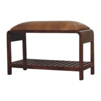 This hallway bench with a slatted shelf is constructed from 100% solid mango wood and the seat is upholstered in 100% buffalo hide leather. Other features include straight feet which have a chestnut finish. As well as being a beautiful piece of furniture it is also very practical for putting on or taking off footwear on and off as well as a under shelf to place your house slippers or footwear.
