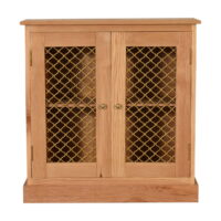 This rustic style cabinet has been constructed from 100% solid oak wood and finished in a smooth oak-ish finish. It features open caged doors and shiny brass knobs. Perfect for a hallway or living room.