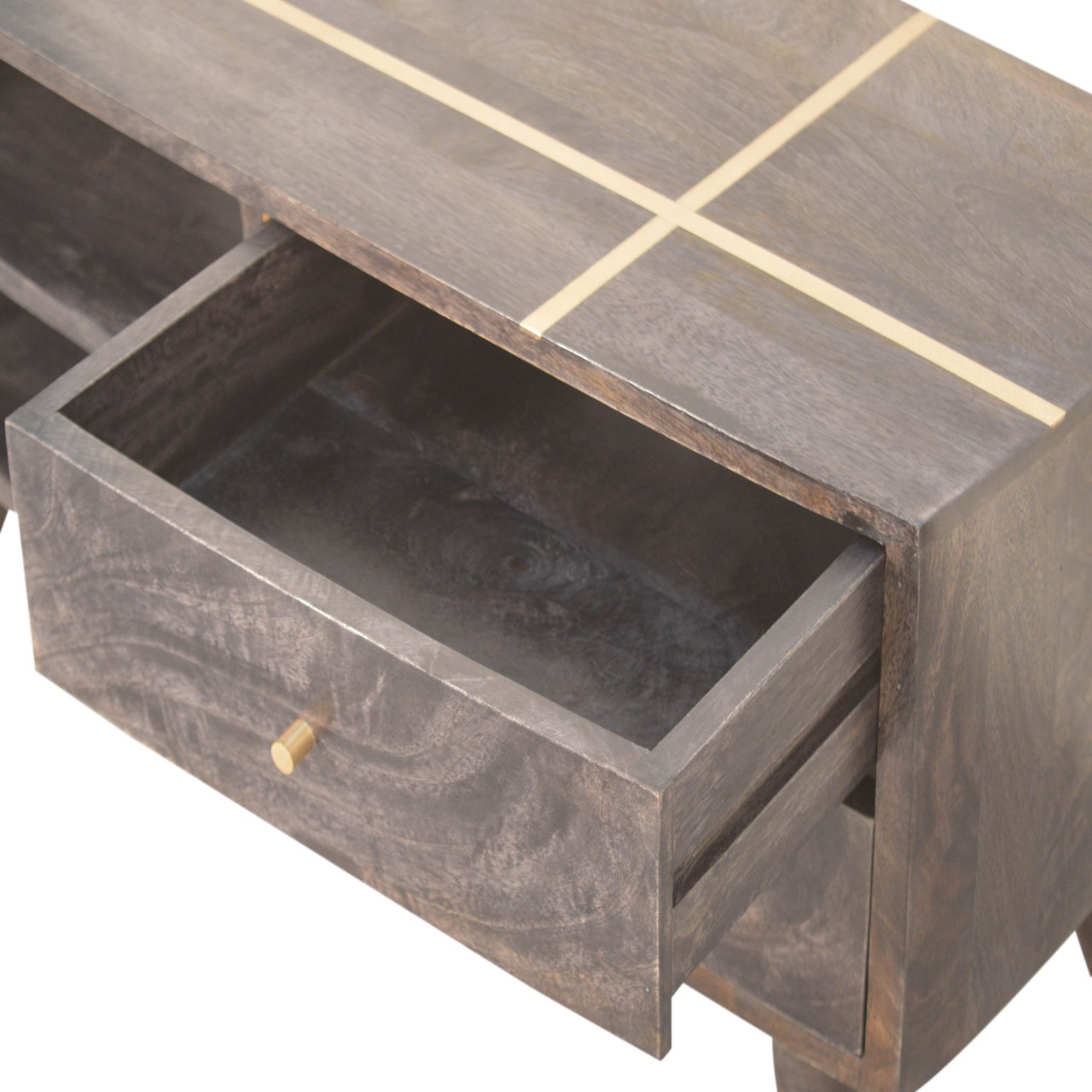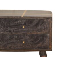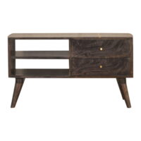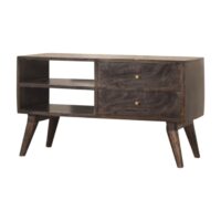 This modern coffee table will add a perfect touch to your living room. Constructed from 100% solid mango wood the beautiful ash black finish reveals the natural wood grain patttern. Convenient storage is offered with the space of 2 drawers and 2 open slots. More items available from the Cairo range.