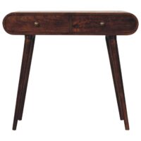 This solid wood console table has been constructed from 100% solid mango wood in a california walnut finish and offers a unique shaped design with rounded edges. It features 2 drawers which come with shiny knobs and Nordic style legs. A great, simple addition to the home.