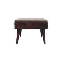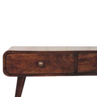 This Coffee Table offers clean, curved edges and has been constructed from 100% Solid Mango Wood in a rich, california walnut finish. It has 4 nordic style legs and features 2 drawers that have a shiny knob, perfect for putting away any books or magazines, as well as space on top for displaying photo frames or ornaments.