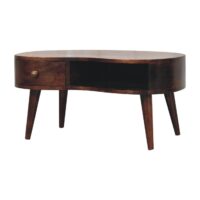 This solid wood coffee table has been constructed from 100% solid mango wood in a california walnut finish and offers a unique shaped design with rounded edges. It features one open slot and one drawer with a shiny knob and Nordic-style legs. A great simple and add to the bedroom.