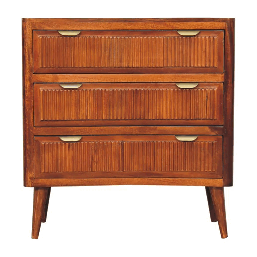 Create a focal point in the bedroom or guest room with our striking Capri Chest. It is constructed from 100% mango wood with a chestnut finish and has a ridged pattern on the drawer fronts. Other features include nordic style legs and brass handles. A matching bedside is available for a co-ordinated look in your home.