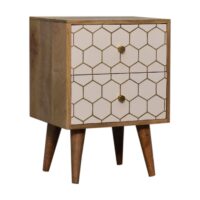 Providing an elegant and sleek design, this 100% solid mango wood bedside has an oak-ish finish and has been given a clear lacquer for extra durability, it features hand-painted white drawer fronts which present a brass honeycomb inlay pattern to put away your bits and bobs. Other features include shiny brass knobs and nordic style legs.