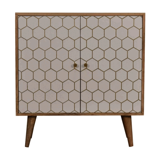 Providing an elegant and sleek design, this 100% solid mango wood bedside has an oak-ish finish and has been given a clear lacquer for extra durability, it features hand-painted white door fronts which present a brass honeycomb inlay pattern and shelves inside to put away your bits and bobs. Other features include shiny brass knobs and nordic style legs.