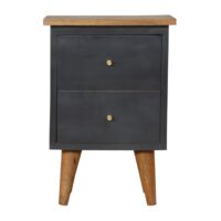 This bedside table has been constructed from 100% solid mango wood and finished with a oak-ish finish top and legs. The body of the bedside has been finished in a hand-painted charcoal black paint and features shiny knobs on the 2 drawers for easy access. This bedside is bound to spice up your bedroom.
