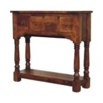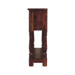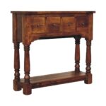 The perfect piece of furniture for any living space is this narrow console table, which is constructed from 100% solid mango wood and has a chestnut finish. It has features such as hand-turned legs, four drawers that come with shiny handles, and a lower shelf for extra storage.