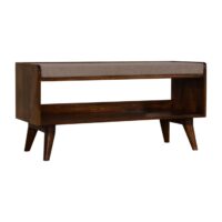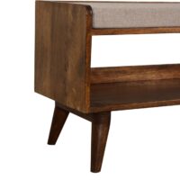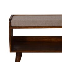 This bench has been beautifully made from 100% solid mango wood in a chestnut finish. This bench provides comfort ability with a comfy seat pad upholstered from brown tweed and can be used in a variety of settings such as the bedroom, hallway or living room.