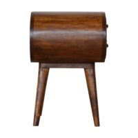 This round style bedside has been constructed from 100% solid mango wood in a chestnut finish. It features 2 drawers which provide great storage and will come in handy before bedtime. Some other features include 4 Nordic style legs and shiny knobs on the drawers. It can be used alone or be partnered with the other rounded furniture pieces from the collection.