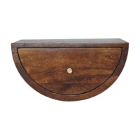 Introducing our wall-mounted bedside, a charming addition to your bedroom. With its crescent shape and 1 drawer, it combines elegance and functionality. Crafted from 100% solid mango wood in a chestnut finish it has a shiny brass knob that adds a touch of sophistication.