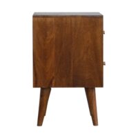 The main feature of this bedside is the hand carved cube drawer fronts which make the pieces from this collection stand out. It has been constructed from 100% solid mango wood in a chestnut finish and stands on 4 Nordic style legs. It can be partnered with the other pieces from the range or stand individually as its style is versatile and can fit into different types of interiors.
